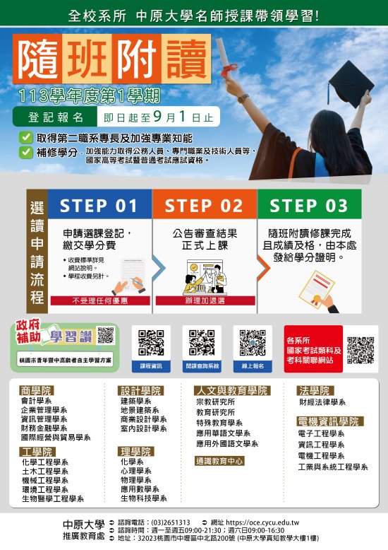 一、 | 中原大學全系所全面開放113學年度第1學期隨班附讀,第2階段選讀登記報名自即日起至113年9月1日止。 |