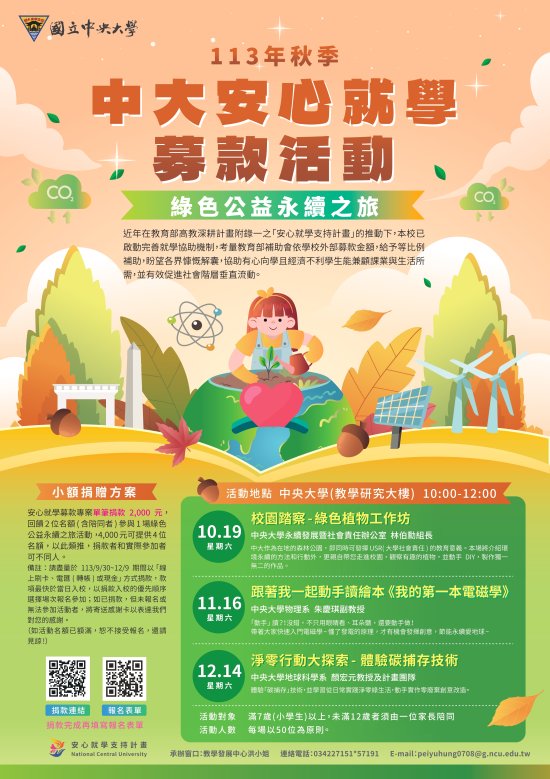 主旨: | 本校辦理「113年秋季中大安心就學募款-綠色公益永續之旅」,敬請協助宣傳,詳如說明,請查照。 |